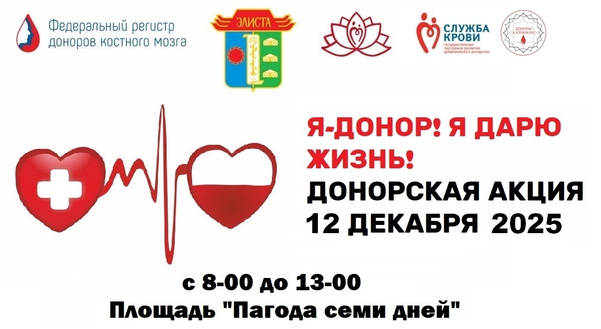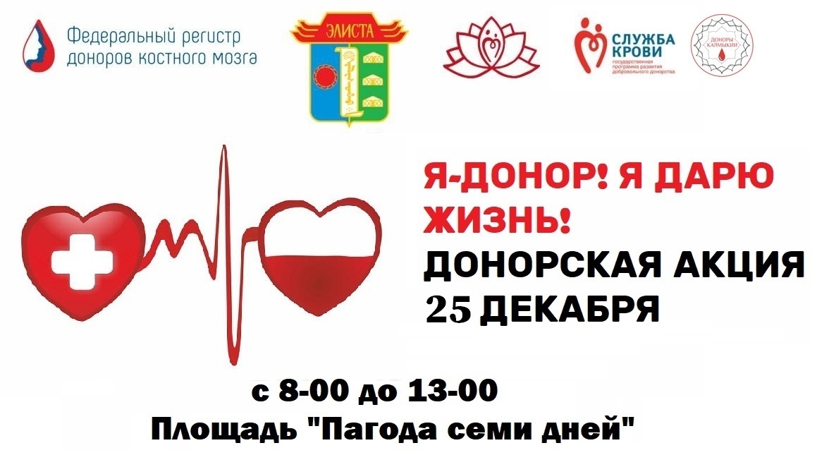 ✅23 декабря с 8-00 до 13-00 на стоянке возле гостиницы Элиста состоится региональная донорская акция "Я-ДОНОР! Я ДАРЮ ЖИЗНЬ!".