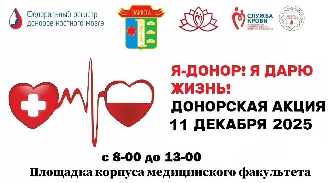 ✅11 декабря с 8-00 до 13-00 на площадке корпуса медицинского факультета Калмыцкого государственного университета имени Б.Б. Городовикова (холл БПА) состоится региональная донорская акция "Я-ДОНОР! Я ДАРЮ ЖИЗНЬ!".